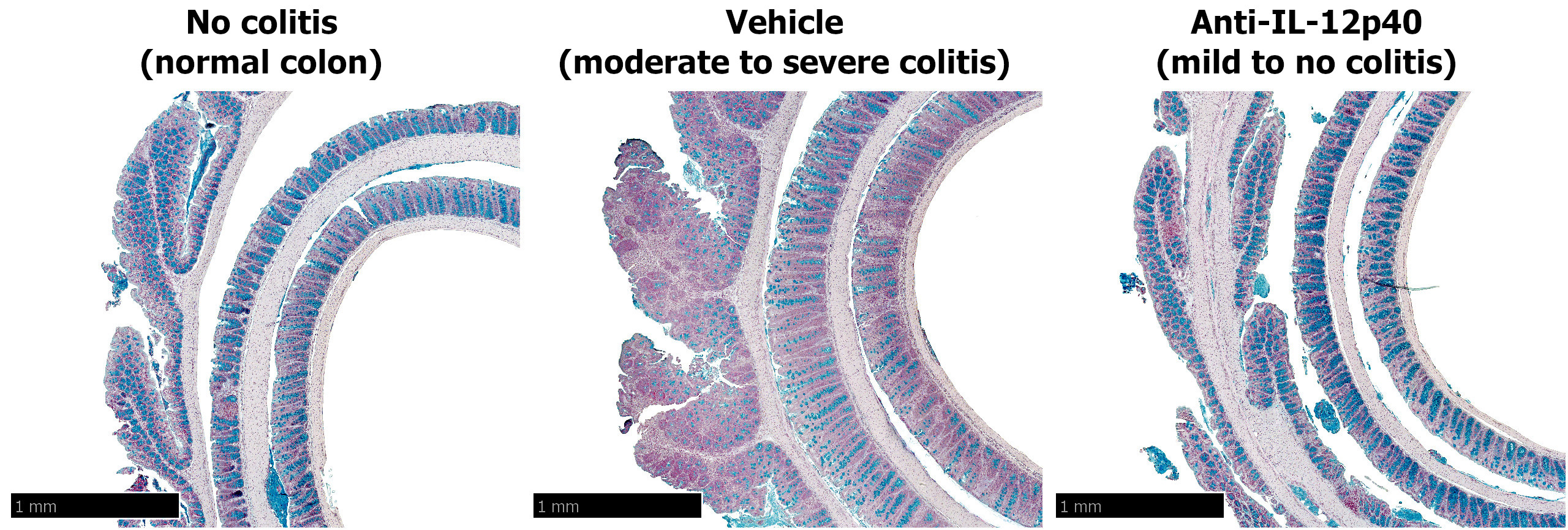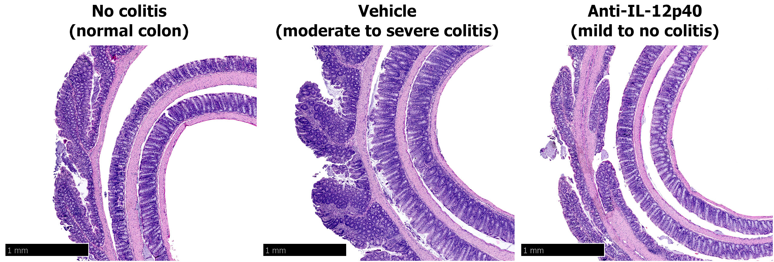 This model is short, with significant elevation in serum cytokines on Day 1 after anti-CD40 injection and colon pathology by Day 5. The model is well-suited to studying innate immune responses in IBD. Inhibition of TNF, IFNγ, or IL-12/IL-23 p40 reduces or blocks disease development [2].